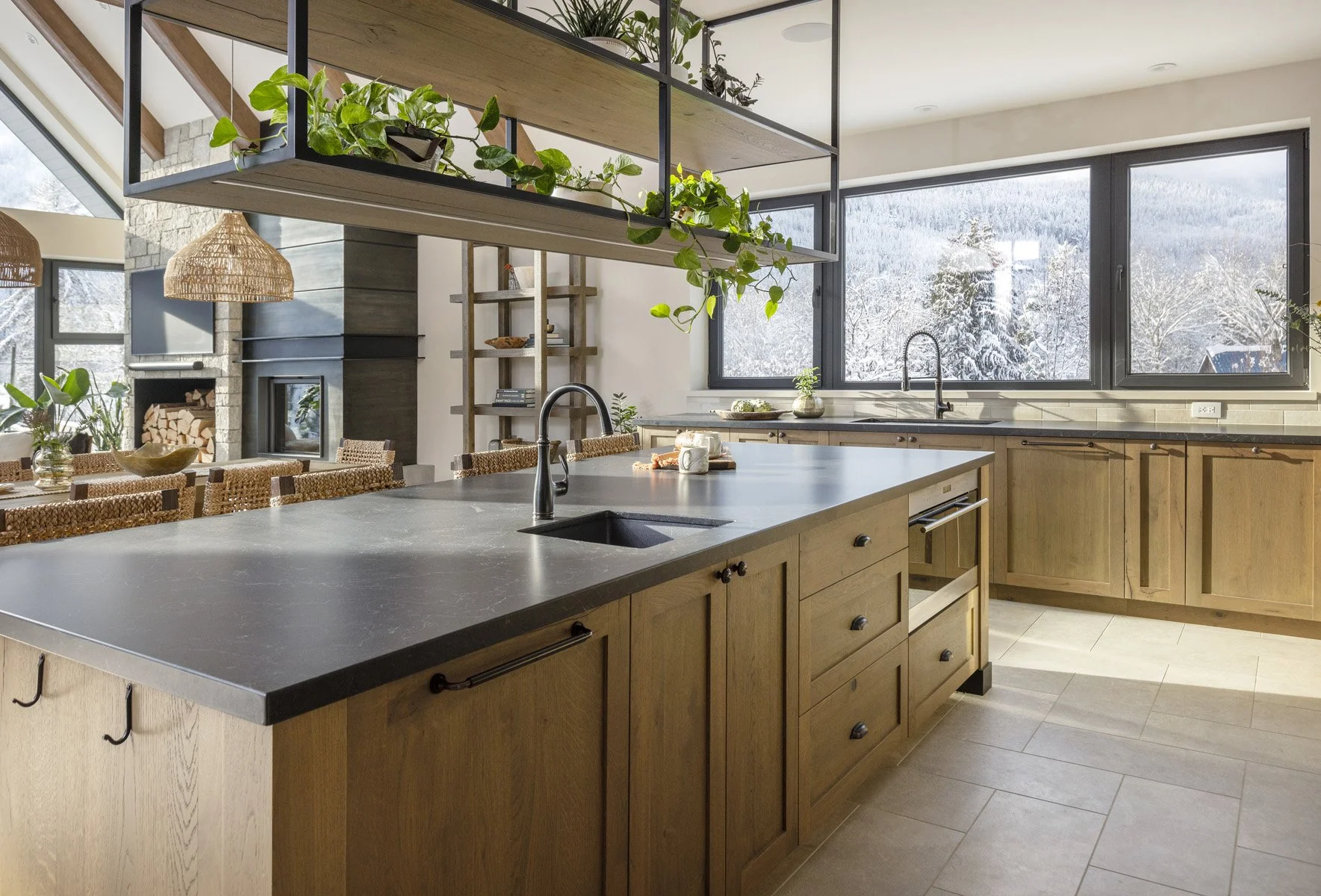 We provided the full millwork package for this custom home in Pemberton Valley—a modern interpretation of the classic farmhouse. Built-ins feature furniture-style legs, refined farmhouse accents, and a knotty European oak veneer with rustic charm. Other notable highlights include a custom metal frame suspended above the kitchen island and complimentary millwork details throughout the bathrooms, laundry, mudroom, and media room.